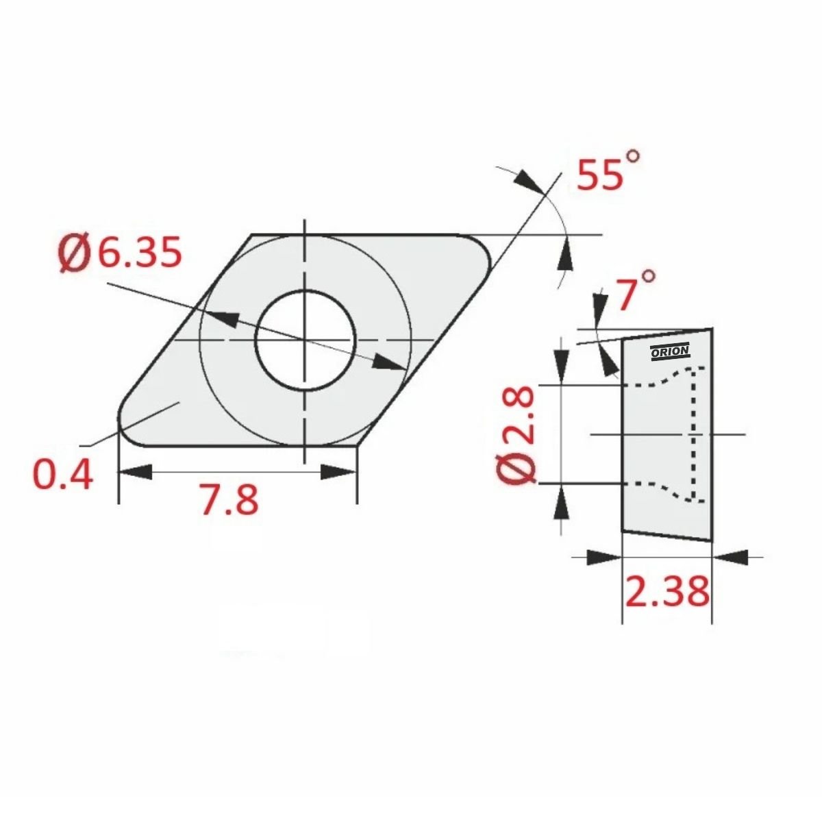 .tamanho da aresta da pastilha: 7,8 mm;